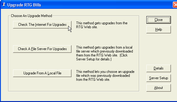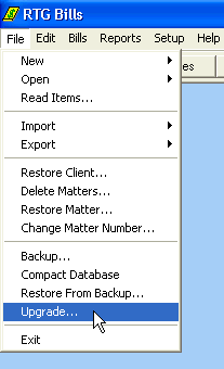 The next step is to install RTG Bills Import, a program that reads fees from other programs into RTG Bills. Start RTG Bills, choose File > Upgrade, and click Yes to start RTG Upgrade.