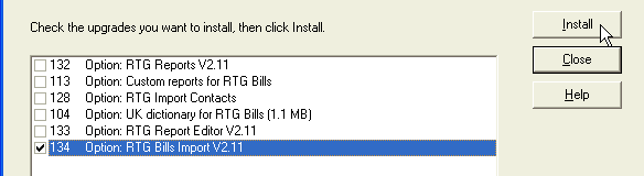 In the list of upgrades, look for RTG Bills Import. Click the box to put a check mark next to this item. Click Install to download and install RTG Bills Import.