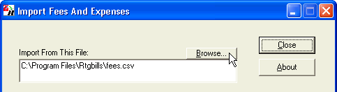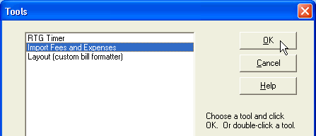 Start RTG Bills and choose File > Tools from the menu. Click on Import Fees and Expenses in the list of tools, then click OK. RTG Bills Import will start.