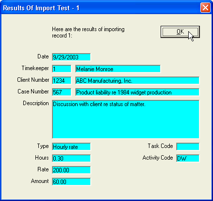 To test that everything is set up properly, click the 2. Test button. RTG Bills Import will read the time entries from the file you selected. First you should see a message telling you that no formatting errors were found. It should also display a record count (how many time entries are in the file created by Amicus Attorney).