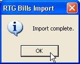 The data has now been read into the RTG Bills database. The name of the file you imported has been changed so the extension is now .bak. That should prevent you from accidentally importing the same data twice.
