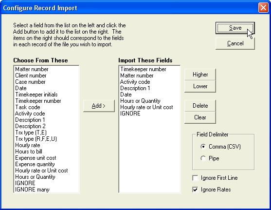 Whether to check Ignore Rates or not is up to you. If it is checked, RTG Bills will use the standard rate for the timekeeper (from the appropriate rate table) to set the hourly rate for each transaction, and the rate assigned by Amicus Attorney is ignored. If the box is not checked, RTG Bills will use the rate that was added to the transaction by Amicus Attorney.