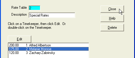 Each rate table has a rate for every timekeeper. Select the timekeeper to change and click Edit.