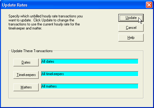 RTG Bills can go through all of the unbilled fees and put in the current rates. Or you can limit the transactions that are changed to specific dates, timekeepers, and matters.