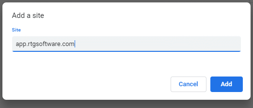 Under Popups and redirects, confirm that it says Blocked (recommended). In the Allow section, click Add. In the box that appears, enter app.rtgsoftware.com. Click Add.